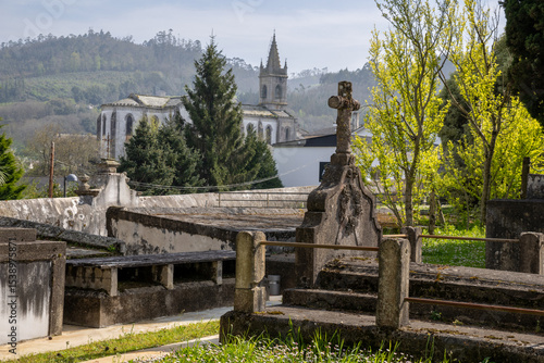 Iglesia Nueva de Santiago seen from ancient graveyard in Mondoñedo, Galicia. Surrounded by green landscape and quiet nature.