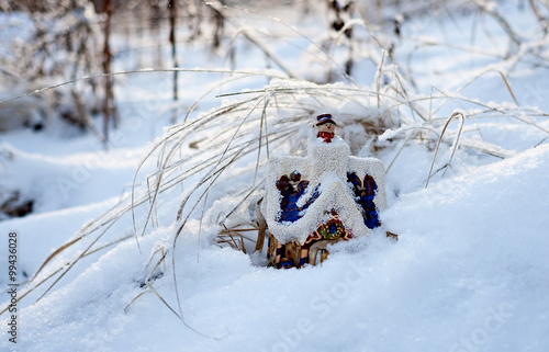 Игрушечный домик в снежном сугробе, освещённом солнцем.