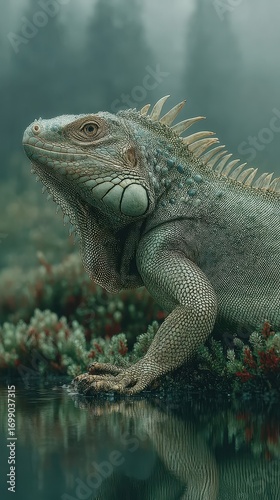 Iguana resting on a mossy rock by the calm waters in a misty forest during early morning