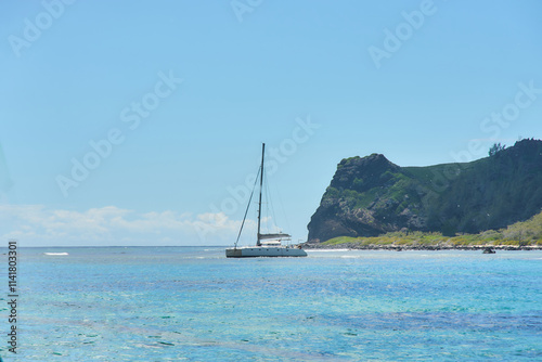 Île Plate (Flat Island) is a picturesque island in the Indian Ocean with a catamaran near located off the northern coast of Mauritius.