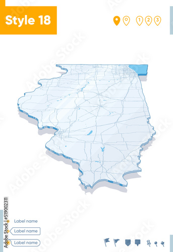 Illinois, USA - 3d map on white background with water and roads. Vector map with shadow.