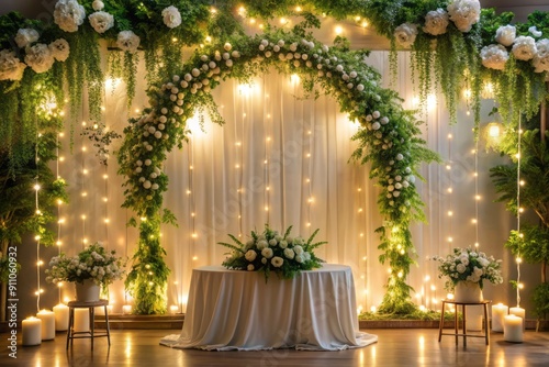 Illuminated arched wedding reception backdrop with greenery, flowers, and lights, surrounded by elegant decorations, perfect for celebration moments and copy space.