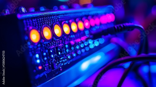 Illuminated audio mixer with glowing buttons and cable.