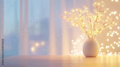 light, vase, branch, illuminated, table, glowing, warm, cosy, winter, home, decor, interior, design, arrangement, bright, white, flower, elegant, soft, romantic, fairy, sparkly, festive, holiday, christmas, beautiful, serene, peaceful, calm, tranquil, still, life, photo, minimalist, simple, modern, aesthetic, ambient, atmosphere