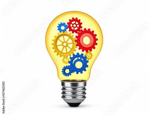 light, bulb, gear, innovation, idea, creativity, bright, yellow, red, blue, colourful, solution, problem, thinking, progress, technology, design, concept, imagination, mechanism, potential, illumination, inside, transparent, three-dimensional, graphic, illustration