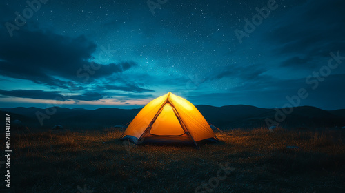 Illuminated camping tent on a grassy yard beneath a starry sky during a family holiday