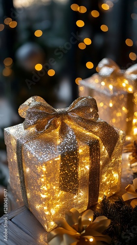christmas, gift, box, decor, light, holiday, festive, decorated, ornament, present, illuminated, wrapping, party, celebration, sparkling, warm, interior, home, cosy, tabletop, light, design, decoration, decorative, elegant