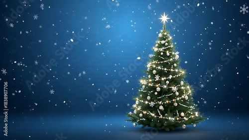 christmas, tree, snow, snowflake, winter, holiday, season, festive, decoration, light, illuminated, glowing, night, dark, blue, background, celebration, joy, merry, spirit, ornament, star, evergreen, pine, fir, sparkling, magical, wonderland