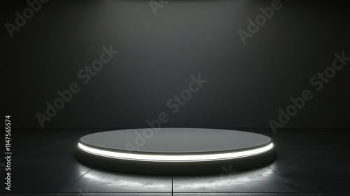 platform, circular, illuminated, dark, room, grey, black, floor, light, background, minimal, modern, design, abstract, stage, display, showcase, presentation, product, empty, space, clean, simple, texture, surface, smooth, round, circle, neon, glow, bright, contrast, sleek, studio, scene, setting, environment, interior, architecture, graphic, element, concept