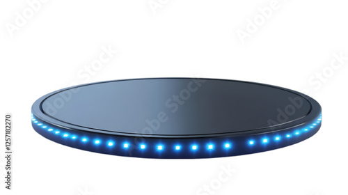 technology, display stand, stage, pedestal, round, circle, dark background, lighting, light effect, sleek, smooth, metallic, grey, blue, black, presentation, showcase, abstract, digital artwork, futuristic, science fiction, clean, minimal, simple, elegant