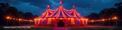Illuminated circus tent at night Canvas glows under spotlights , shadow, big top