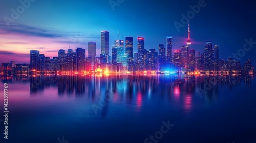 Illuminated Cityscape at Twilight Reflecting on the Calm Waters, Toronto