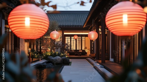 lantern, courtyard, asian, traditional, japanese, chinese, architecture, design, interior, exterior, garden, peaceful, serene, tranquil, calm, relaxing, light, illumination, red, orange, warm, glow, evening, night, dusk, water, feature, duck pond, rock, stone, plant, tree, shrub, wood, dark, modern, minimalist, contemporary, style, aesthetic, ambience, atmosphere, elegance, sophisticated