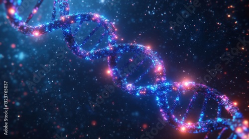 Illuminated DNA Strand in Futuristic Digital Art Style with Vibrant Neon Lights and Cosmic Background Exploring Genetic Engineering and Recombinant DNA Technology