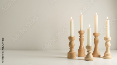 Illuminated Elegance Five Tapered Candles Alight in Simple Wooden Candle Holders on a White Surface