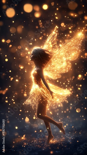 Illuminated fairy silhouette with glowing wings and sparkles on a dark background