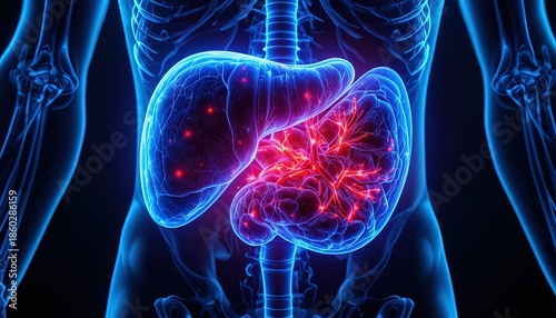 Illuminated internal view displays the human liver structure with areas of pathological activity highlighted in red light