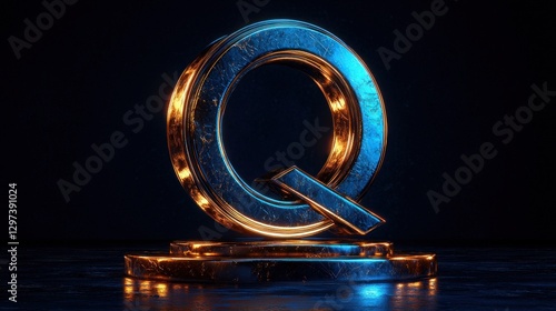letter, alphabet, glowing, metallic, blue, gold, reflective, surface, pedestal, font, type, typography, character, elegant, luxury, design, branding, artistic, modern, style, decorative, signage, symbol, representation, aglow, sheen, shine, polished, dark, background, display, stage, showcase, presentation, texture, crafted, detailed, futuristic, concept, three-dimensional, render