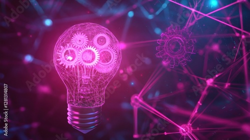 light bulb, gear, network, innovation, idea, creativity, technology, connection, system, mechanism, engineering, design, concept, abstract, digital, futuristic, modern, science, progress, solution, intelligence, brain, thinking, cognition, wisdom, power, energy, bright, glow, pink, purple, line, point, node, structure, complex, intricate, vibrant, background, graphic, illustration, visual