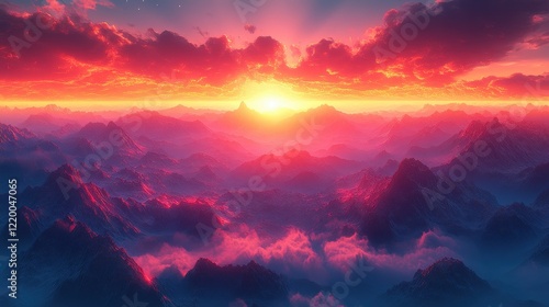 Illuminated Majesty - Sunrise over Majestic Mountain Range in Isometric View with Ethereal Glow