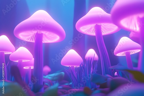 Illuminated mushrooms in a forest. Surreal, magical, and futuristic scene in nature. Use for fantasy backgrounds