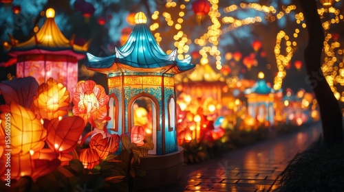 Illuminated path lined with colorful paper lanterns and Chinese-style pavilions
