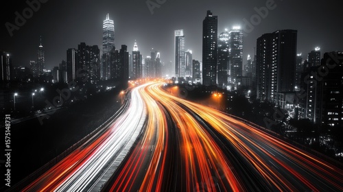 city landscape, urban, night, light, trail, traffic, motion, blur, road, highway, modern, building, skyscraper, architecture, illuminated, asia, transportation, movement, speed, infrastructure, metropolis, downtown, darkness, long exposure, skyline, development, journey, direction, stream, rush, dynamism, fluidity, future, perspective, vibrant, orange, white, black, grey, contrast, pattern, blurred, abstract, travel, destination, connection, pathway