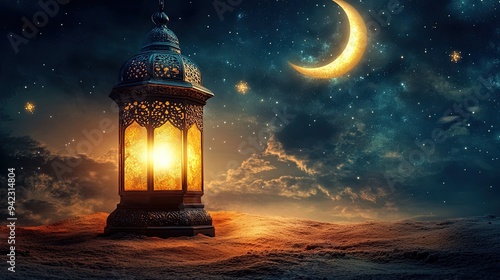 lantern, ramadan, night, sky, star, crescent, moon, islam, faith, spiritual, holy, prayer, candle, glow, light, dark, mystical, religious, hope, peace, belief, divine, culture, tradition, festival, celebration, gold, blue, yellow, brown, sand, desert, background, landscape, image, photo, digital, art, artistic, fantasy