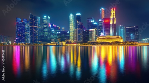 skyscraper, city, building, night, city landscape, water, light, urban, modern, architecture, glasses, steel, skyline, illuminated, neon, colourful, vibrant, bright, glow, dark, blue, yellow, red, purple, pink, orange, river, waterfront, harbor, singapore, asia, evening, dusk, landscape, photo, travel, tour tourism, scenery, landmark, iconic, metropolis