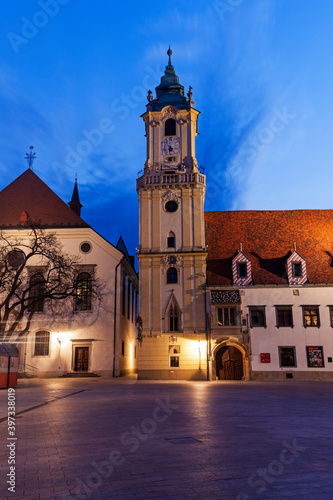 no people, vertical, outdoors, dusk, sky, illuminated, building exterior, architecture, facades, city hall, capital city, town square, tower, bell tower, bratislava, capital, city, europa, main, square, slovakia, blue, church, downtown, landmark, night, old, town, hall, skyline, travel