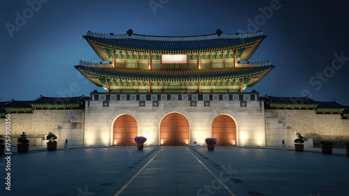 night time, illumination, gate, facades, potted plants, purple flower, entrance, wide