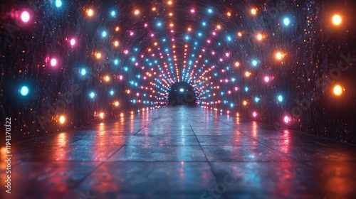 Illuminated tunnel, colorful lights, futuristic background, abstract art, digital rendering