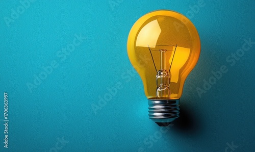 light bulb, yellow, light, blue, background, illumination, glow, bright, illuminated, warm, metal, footed, round, three-dimensional, object, simple, shape, geometric, design, abstract, concept, idea, innovation, creativity, solution, problem, thinking, progress, inspiration, cognition, learning, orange, warmth, image, graphic, visual, modern, clean, studio, lighting