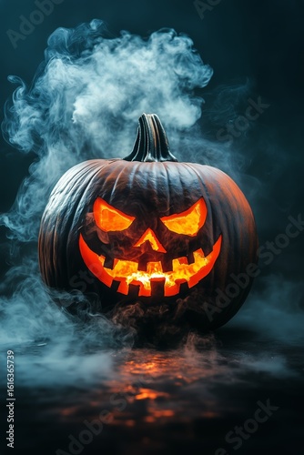 Illuminating Pumpkin With a Spooky Grin in a Misty Halloween Setting.