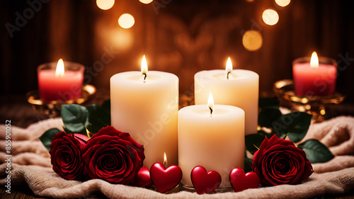 Illustrate a romantic beautifully roses and heart-shaped candles. Add a soft bokeh effect in the background to enhance the intimate and cozy atmosphere