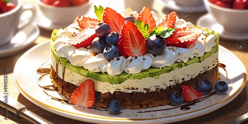 anime, style, dessert, platter, creamy, cheesecake, chocolate, mousse, fruit, tart, fruit, kiwi, strawberry, sweet, illustration, pastry, food, epicure, cartoon, colourful, delicious, art, vibrant, cake, bakery, cute, artistic, fantasy, creative, tasty, whipped, cream, luxury, indulgent, sugar, confectionery, design, visual, aesthetic, drawing