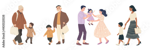family outing, illustration, togetherness, collection, colourful, isolated, diverse, element, moment, walking, family, mother, outing, eltern, people, vector, children, happy, mixed, urban, children, set, diversity