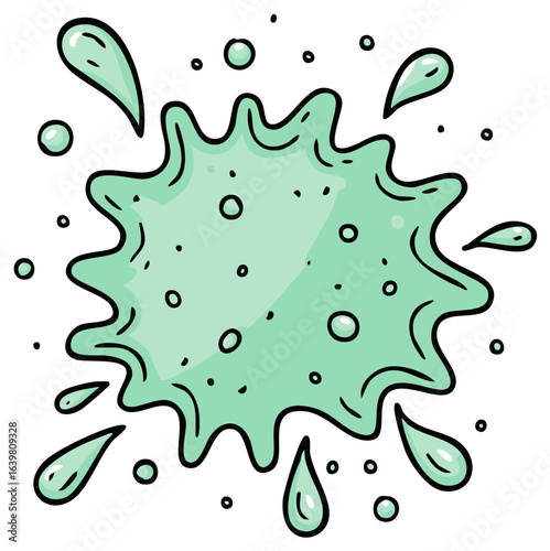 Illustrated Green Blot Exploding with Droplets and Circles in Cartoon Style