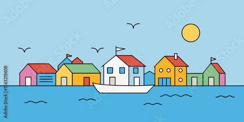 illustrated, village, scene, colourful, home, boat, harbor, fishing, sea, shore, coast, water, sky, cloud, sun, horizon, people, wave, activity, community, lifestyle, architecture, building, market, small, town, illustration, art, style, drawn, print