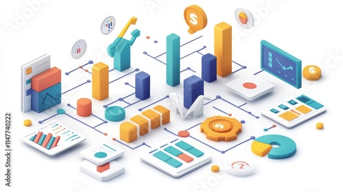 Illustration. A pastel-colored digital marketing system, visually representing efficiency and effectiveness, featuring simple icons like graphs and checkmarks, interconnected in a streamlined design