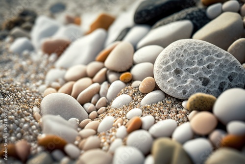 illustration, calm and captivating, a close up of a pebble beach, ai generative