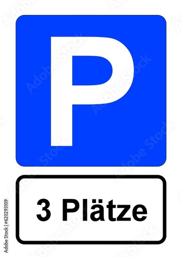 Illustration eines blauen Parkplatzschildes mit der Aufschrift "3 Plätze"