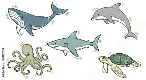 whale, dolphin, shark, octopus, sea turtle, ocean, marine life, animal, illustration, drawing, aquatic, mammal, fish, reptile, cephalopod, underwater, wildlife, sea, creature, vignetting, cartoon, nature, oceanic, swimming, tentacle, fin, shell, water, artwork, fauna
