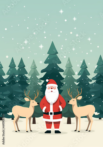 illustration for cartoon style Christmas card with santa, rudolfs, and snowy trees.
