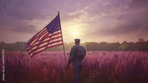Illustration for Independence Day of the United States, July 4th - Soldier with American flag under a beautiful sun. Generative AI