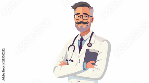 Illustration of a confident male doctor with a beard, wearing glasses, a stethoscope, and holding a clipboard.
