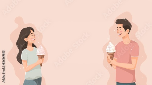 illustration, couple, ice cream, cone, copy space, background, man, woman, smiling, happy, dessert, sweet, treat, together, human relationships, casual attire, holding, pastel, gentle, light, pink, fun, summer, enjoyment, food, friendship, love, cartoon, graphic, design, art, drawing, couple, people, character, young, leisure, relaxation, affection, bonding, outdoors, joy