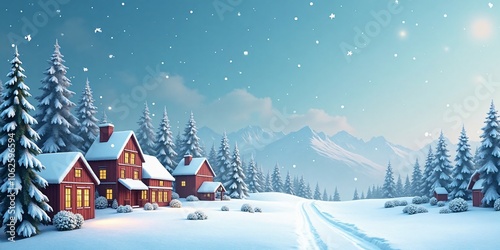 Illustration of a cozy Christmas village scene with snow-covered roofs on the left side, leaving the right side blank for text in a wintery sky.