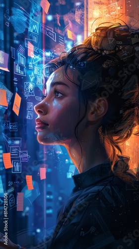 Illustration of a creative professional brainstorming ideas with an AI chatbot, visualized through a series of interactive digital notes