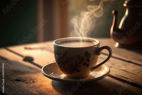 cup, hot drink, drink, cafes, tea, white, mug, table, espresso, hot, breakfast, beverage, caffeine, black, brown, saucer, cappuccino, food, morning, aroma, closeup, smoke, steam, spoon, ai, illustration, latte, milk, cream, foam, chocolate, art, isolated, warm, culture, coffee cup, eatery, porcelain